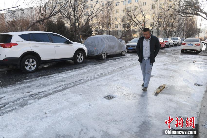 长春一小区水管爆裂变冰场 车身挂冰柱