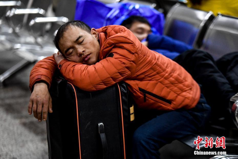2月12日凌晨,一名候车的旅客在广州火车站内熟睡。 中新社记者 廖树培 摄