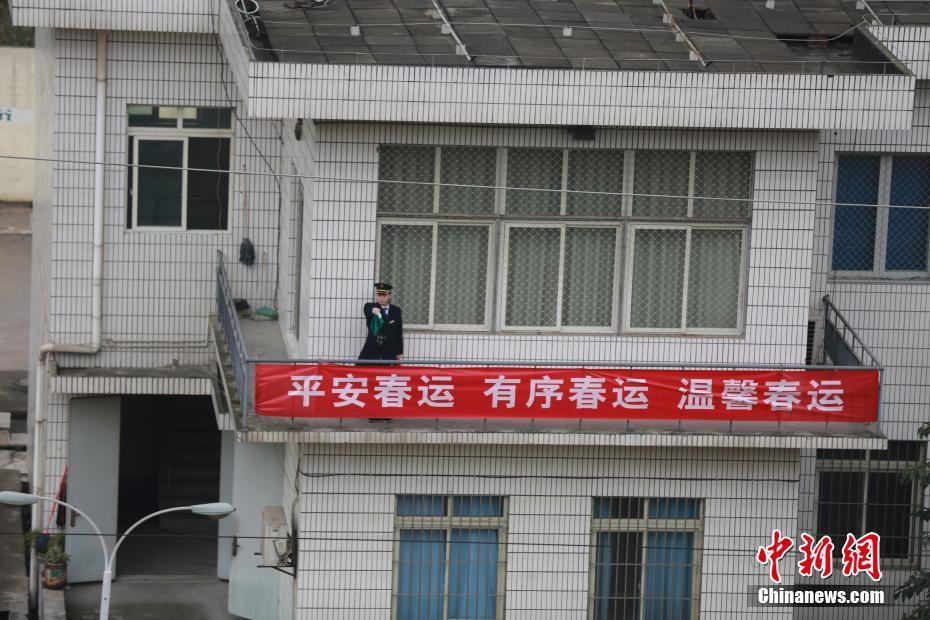 近日,重庆歌乐山“迷你”火车站的工作人员春运期间进行24小时的轮流值班。据悉,该火车站小站常驻职工仅有6人,只办理列车会让和越行,每日接发列车80对,其中动车高铁50对。图为火车站工作人员正在进行接发列车。 苏自刚 摄