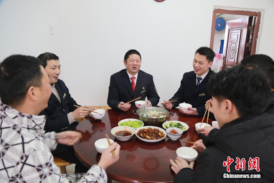 近日,重庆歌乐山“迷你”火车站的工作人员春运期间进行24小时的轮流值班。据悉,该火车站小站常驻职工仅有6人,只办理列车会让和越行,每日接发列车80对,其中动车高铁50对。图为火车站工作人员正在一起吃饭。 苏自刚 摄