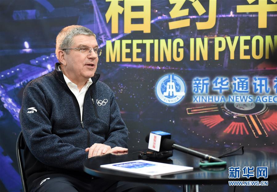 2月12日下午,国际奥委会主席巴赫到平昌冬奥会主新闻中心新华社发稿中心看望新华社采编人员,并在接受专访时现学中文“春节快乐”向中国人民问好。图为巴赫在演播室接受新华社记者专访。(2月12日摄) 新华社记者 毕晓洋 摄