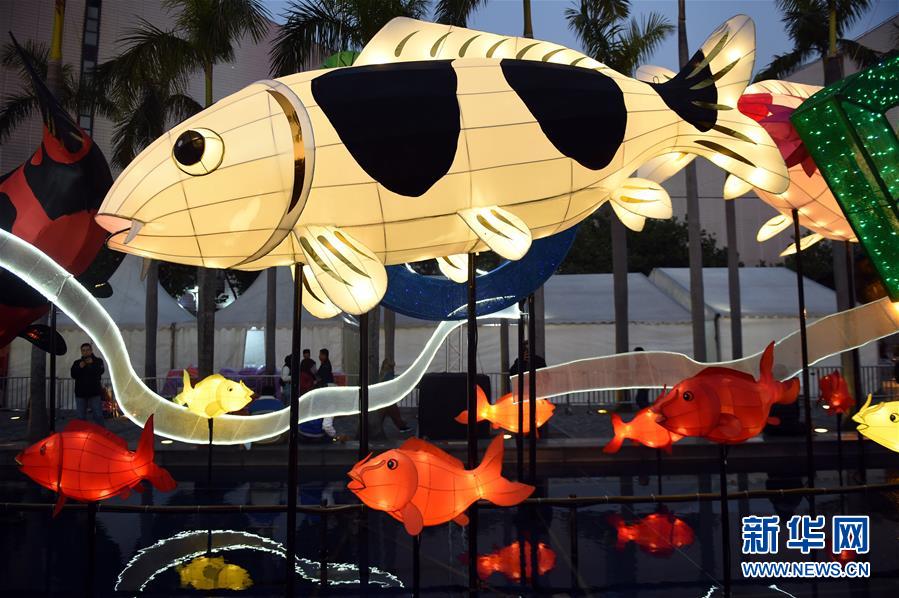 2月12日拍摄的锦鲤造型的彩灯。当日,春节彩灯展在香港文化中心露天广场举行,彩灯展以“锦鲤”为主题,展出90个色彩艳丽、形态万千的锦鲤造型彩灯,营造出浓浓的年味。新华社记者卢炳辉摄