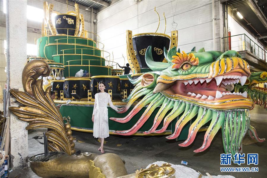 2月8日,在巴西里约热内卢,李珍颖在桑巴城内的“塞拉诺帝国”桑巴舞校场地内留影。新华社记者李明摄