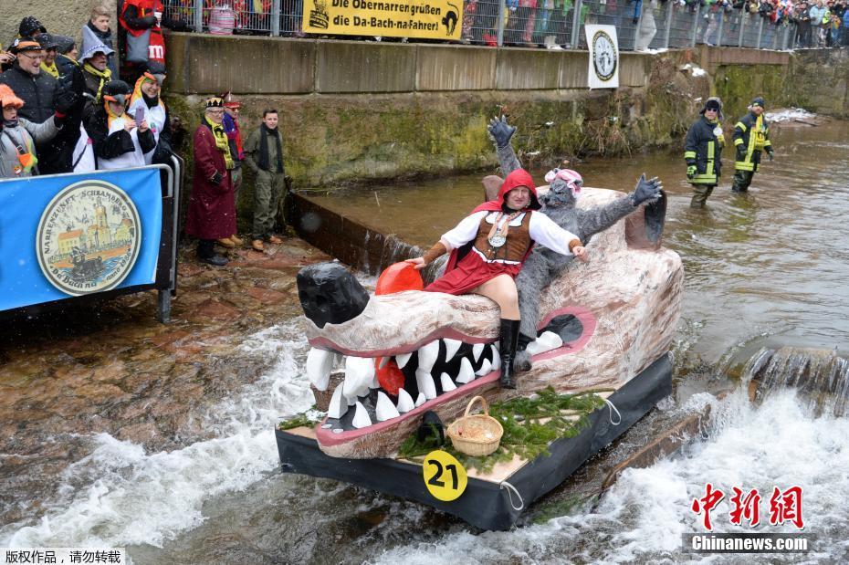 当地时间2月12日,德国施拉姆贝格庆祝“玫瑰星期一”狂欢节,狂欢者参加木筏比赛。