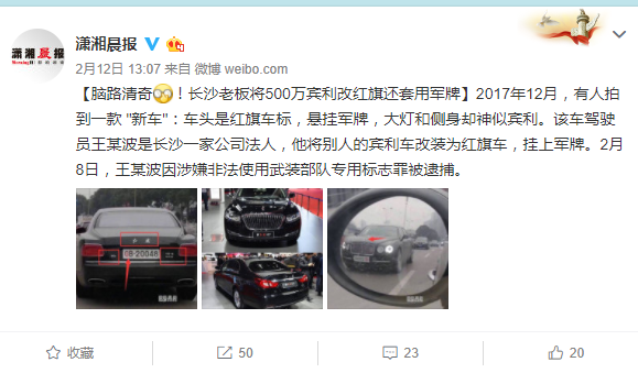 长沙老板将500万宾利改红旗套军牌被捕
