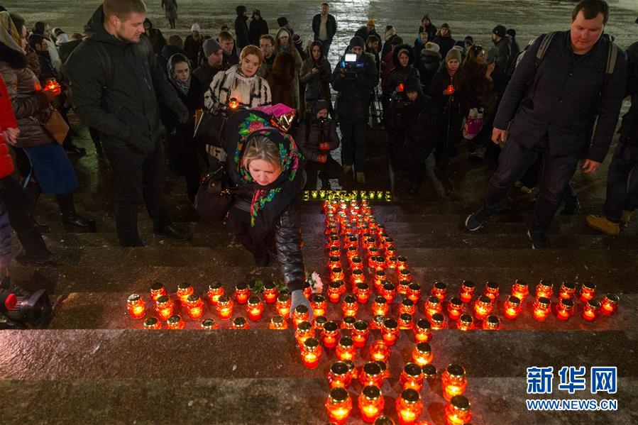 2月12日,在俄罗斯首都莫斯科,一名女子在失事客机遇难者悼念仪式上摆放蜡烛。新华社记者白雪骐摄