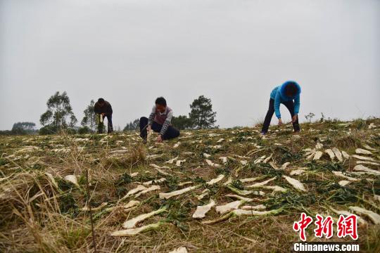 三位农民将晒干的大头菜翻面,使其晾晒均匀。 王以照 摄