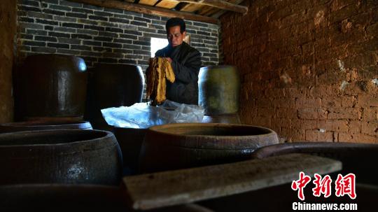 一名农民将晒干的大头菜放入瓦缸中,继续腌制发酵。大头菜将在5个月后达到它的最佳口感。 王以照 摄