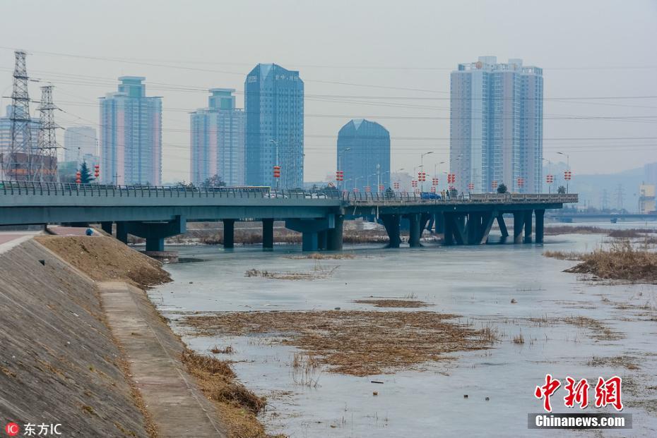 “在宝鸡生活了几十年了,印象中渭河这么长时间结冰的现象不多见,几乎是近十年来最长的一次吧。”渭河公园里,几名老人在一起交流着自己的感受。图为冰冻的渭河河面。 图片来源:东方IC