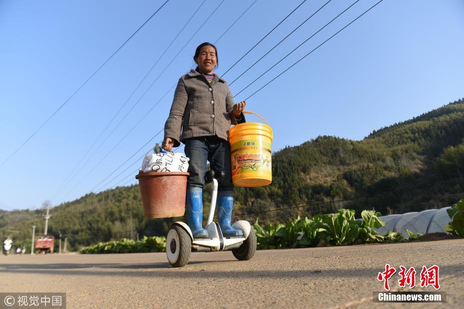 菜农大妈玩转平衡车 脚踏高科技去地里收菜