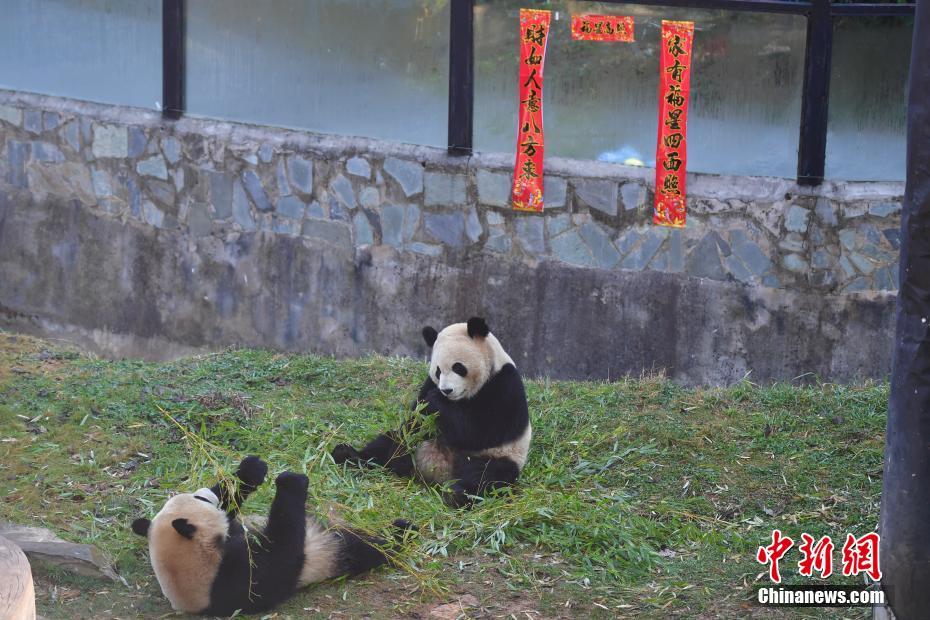 2月13日,大熊猫馆贴上春联。春节来临前,云南野生动物园的饲养员,为园中的动物贴春联、送年货,提前送上节日祝福。 中新社记者 刘冉阳 摄