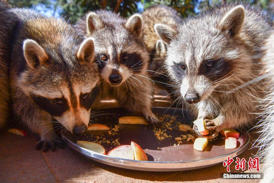 2月13日,小浣熊享用美食。春节来临前,云南野生动物园的饲养员,为园中的动物贴春联、送年货,提前送上节日祝福。 中新社记者 刘冉阳 摄
