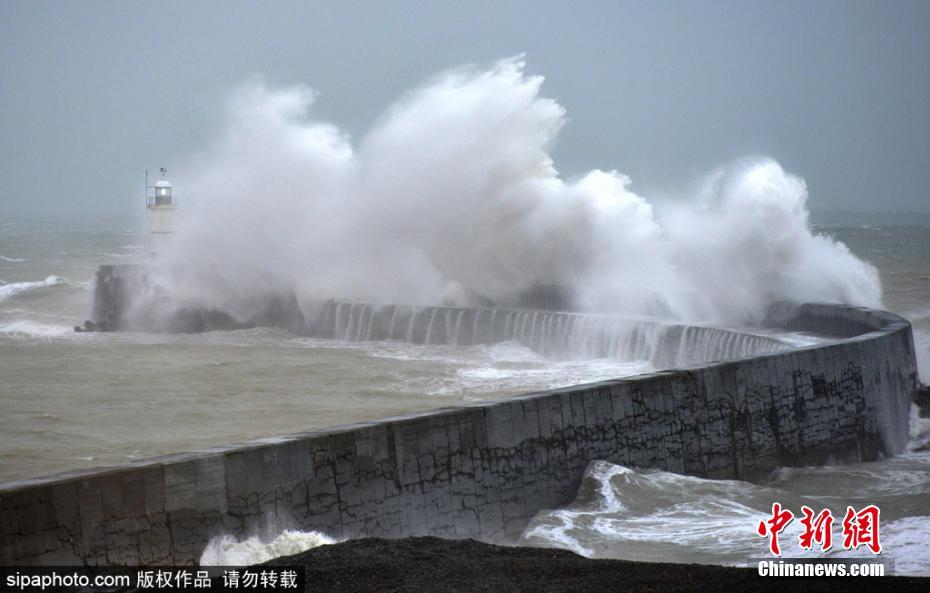 当地时间2月13日,大雨强风袭击英国南部东萨塞克斯郡,在纽黑文港卷起巨浪,场面震撼。 图片来源:SipaPhoto