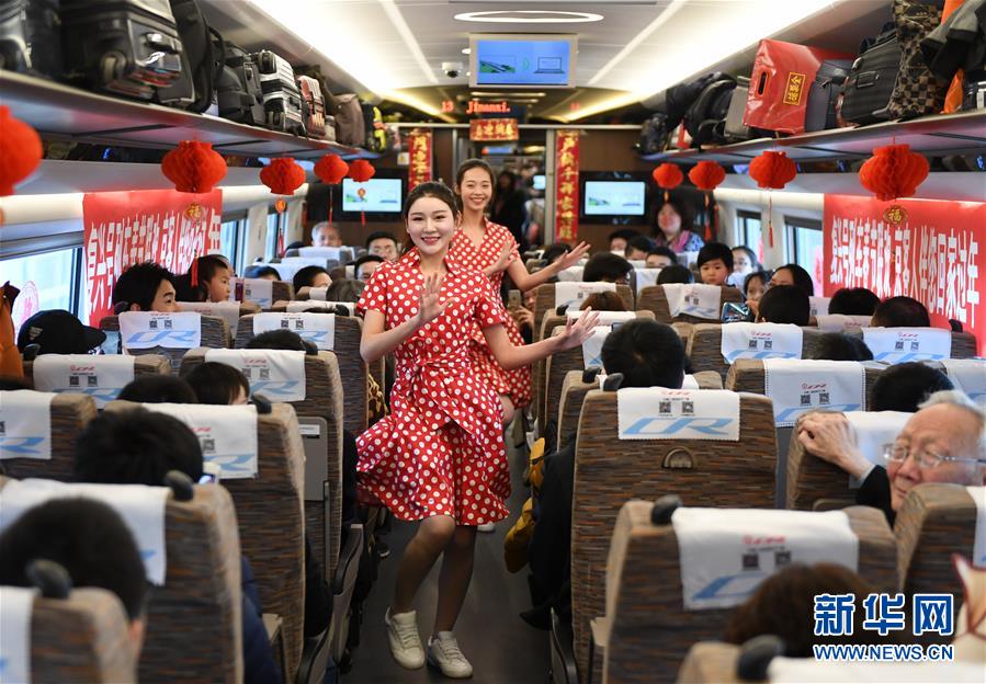 2月13日,文艺小分队的队员在G13次“复兴号”列车上表演舞蹈。当日是农历腊月二十八,北京客运段“传承文艺小分队”在北京南至上海虹桥的G13次“复兴号”列车上为旅客送上一场春节联欢会,让旅客们在旅途中感受到浓郁的节日气氛。新华社记者 张晨霖 摄