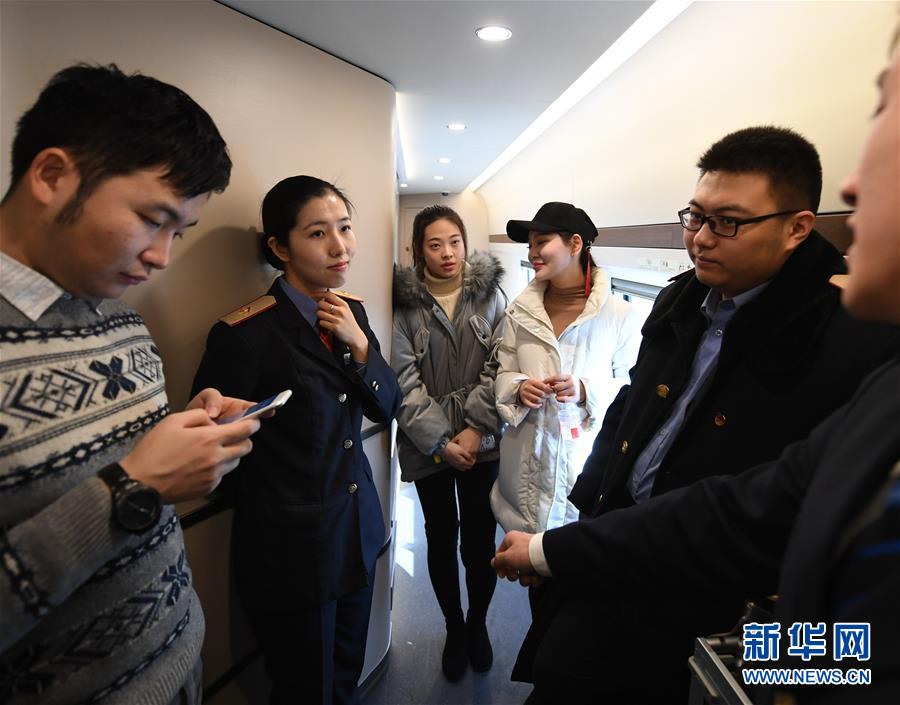 2月12日,文艺小分队的队员在G13次“复兴号”列车上商讨第二天演出的细节。 2月13日是农历腊月二十八,北京客运段“传承文艺小分队”在北京南至上海虹桥的G13次“复兴号”列车上为旅客送上一场春节联欢会,让旅客们在旅途中感受到浓郁的节日气氛。新华社记者 张晨霖 摄