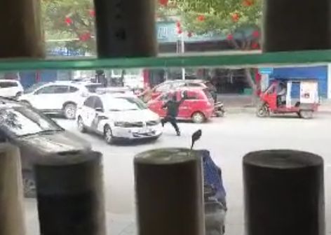 ​2月12日报道,12日中午广西恭城县公安局接民众报警:恭城县恭城镇西城路有一男子手持两把菜刀追砍过路民众。恭城镇派出所值班警察奉110指令驱车前往现场处置,成功制服嫌犯。图为歹徒刀砍出警警车。来源:广西新闻频道