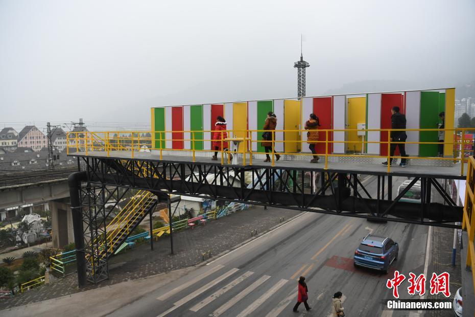 ​2月13日,重庆涪陵红酒小镇一过街天桥上修建了一排“无性别公厕”,天桥下面一直有车来车往,过往民众称这完全像是“空中厕所”。图文:中国新闻网  陈超 摄