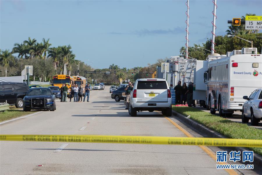 2月15日,在美国佛罗里达州南部帕克兰市,发生枪击事件的一所高中附近拉起警戒线。佛罗里达州帕克兰市一所高中14日发生本州历史上最严重校园枪击案,造成17人死亡。 新华社发(莫妮卡摄)