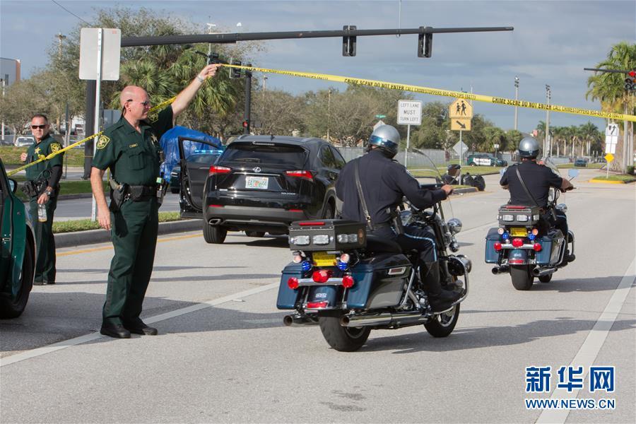 2月15日,在美国佛罗里达州南部帕克兰市,警察在发生枪击事件的一所高中附近执勤。佛罗里达州帕克兰市一所高中14日发生本州历史上最严重校园枪击案,造成17人死亡。 新华社发(莫妮卡摄)