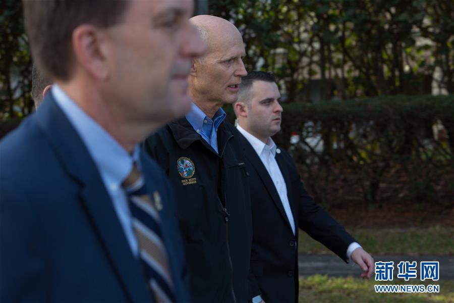 2月15日,在美国佛罗里达州南部帕克兰市,佛罗里达州州长里克?斯科特(中)在枪击事件现场附近查看。佛罗里达州帕克兰市一所高中14日发生本州历史上最严重校园枪击案,造成17人死亡。 新华社发(莫妮卡摄)