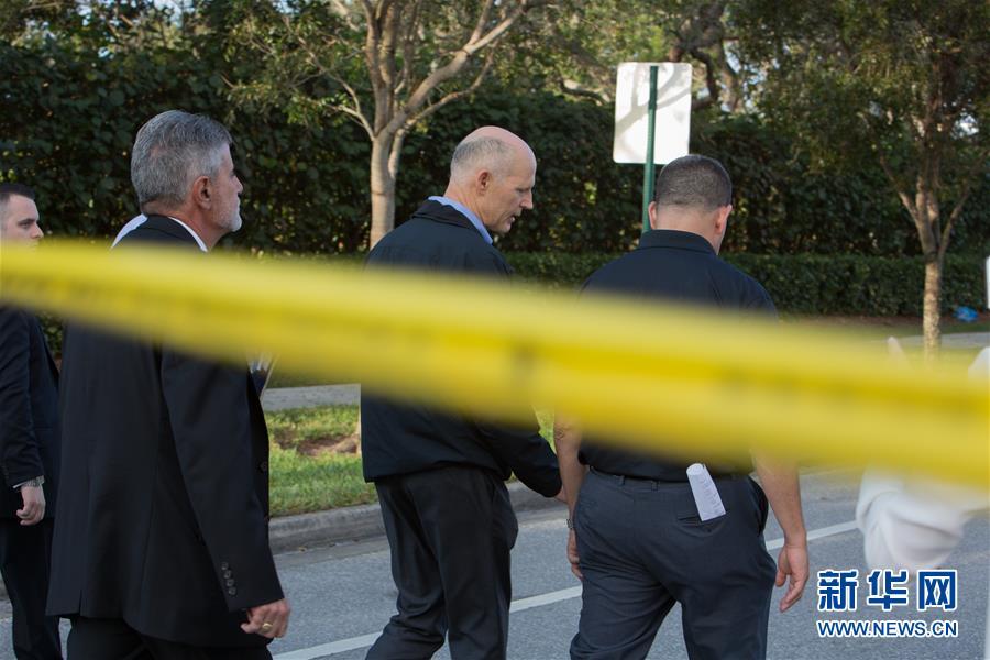 2月15日,在美国佛罗里达州南部帕克兰市,佛罗里达州州长里克?斯科特(右二)在枪击事件现场附近查看。佛罗里达州帕克兰市一所高中14日发生本州历史上最严重校园枪击案,造成17人死亡。 新华社发(莫妮卡摄)
