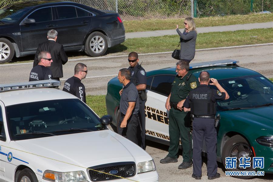 2月15日,在美国佛罗里达州南部帕克兰市,警察在发生枪击事件的一所高中附近执勤。佛罗里达州帕克兰市一所高中14日发生本州历史上最严重校园枪击案,造成17人死亡。 新华社发(莫妮卡摄)