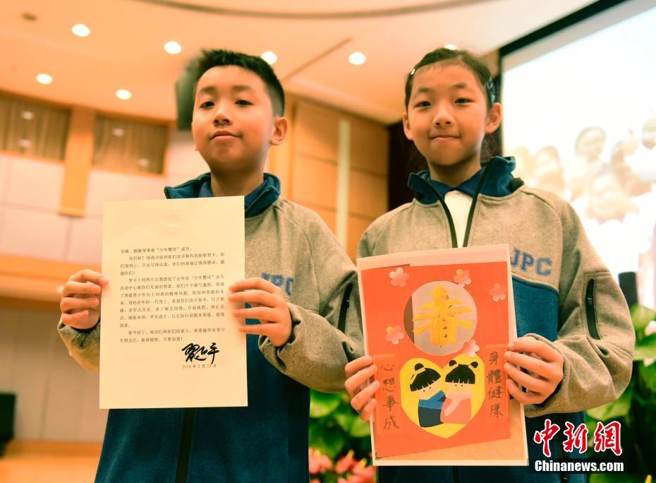 2月15日,中央政府驻港联络办公室主任王志民邀请郭宏晞、罗颢凝同学等26位香港“少年警讯”成员来到中联办大楼,向他们转交了习近平主席的回信,转达了习主席对香港青少年的关心和问候。图为香港“少年警讯”成员郭宏晞(左)展示习主席回信、罗颢凝(右)展示送给习主席的贺卡并合影。中新社记者 徐冬冬 摄