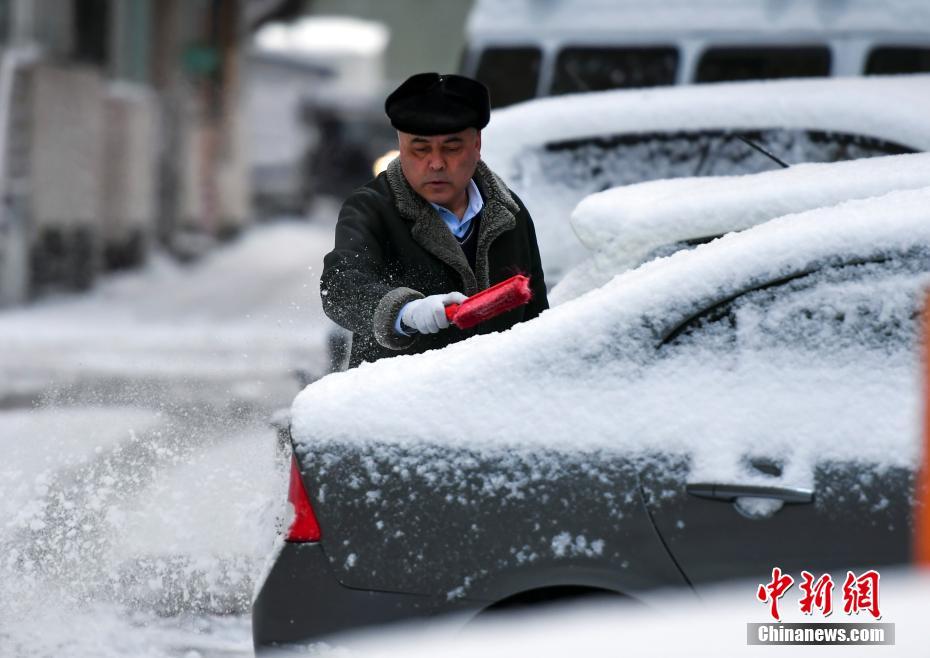 2月16日,农历狗年正月初一,乌鲁木齐民众清理私家车上的积雪准备外出。16日凌晨,一场降雪天气“光临”新疆乌鲁木齐市,整个城市一夜之间“银装素裹”,民众出门便可体会到“瑞雪兆丰年”的美好寓意。中新社记者 刘新 摄