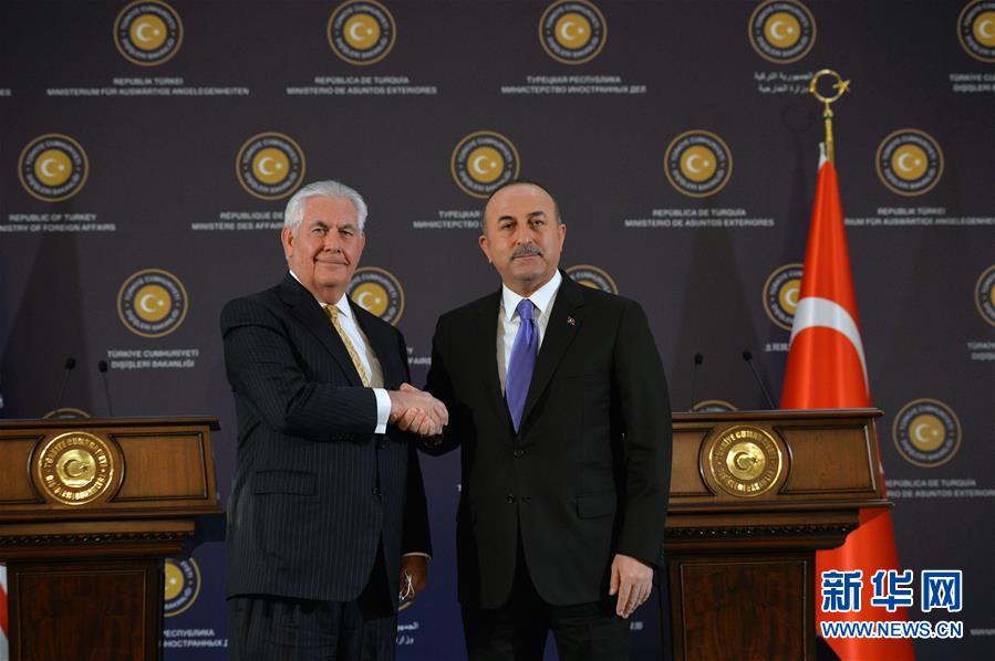 2月16日,在土耳其首都安卡拉,土耳其外长恰武什奥卢(右)和美国国务卿蒂勒森出席联合记者会。土耳其外长恰武什奥卢16日在首都安卡拉表示,土耳其和美国同意建立一个机制以解决两国间一系列争议问题,缓解双边紧张关系,努力实现关系正常化。新华社发(穆斯塔法·卡亚摄)