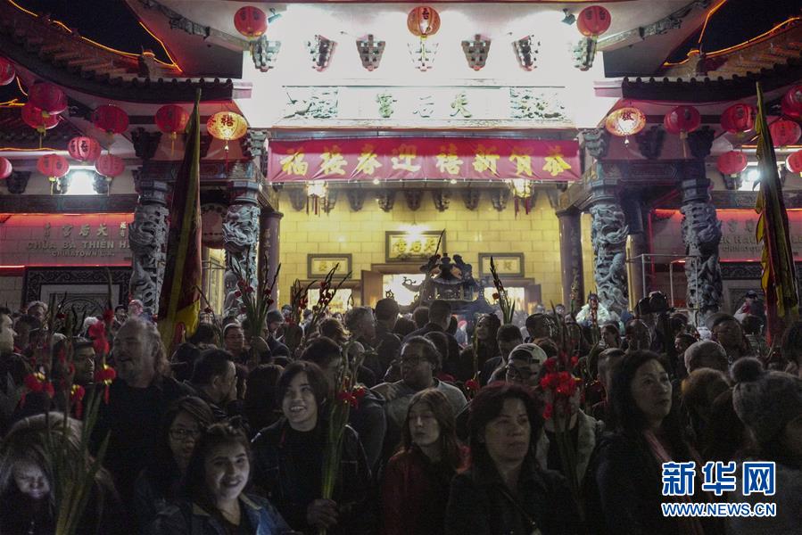 2月16日,在美国洛杉矶,人们在天后宫迎接新年。当日是中国农历正月初一,洛杉矶华人来到中国城天后宫上香祈福,迎接新年。 新华社发(赵汉荣摄)