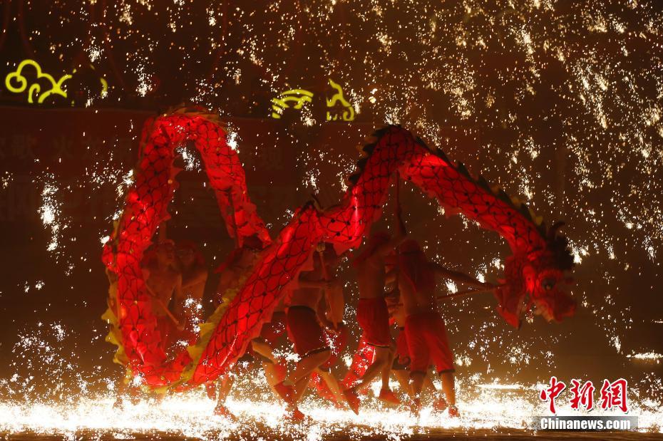 2月18日,重庆铜梁火龙钢花队在北京欢乐谷表演。火龙钢花是国家级非物质文化遗产,源自重庆铜梁,有“中华第一龙”的美誉。高达1500℃的铁水掺杂特制的干花被抛向天空,“铁水流星”瞬间洒向地面,赤膊上阵的舞龙者在“铁水流星”下舞动穿梭。中新社记者 富田 摄