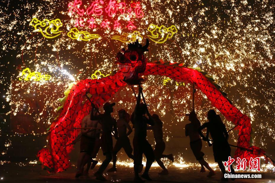 2月18日,重庆铜梁火龙钢花队在北京欢乐谷表演。火龙钢花是国家级非物质文化遗产,源自重庆铜梁,有“中华第一龙”的美誉。高达1500℃的铁水掺杂特制的干花被抛向天空,“铁水流星”瞬间洒向地面,赤膊上阵的舞龙者在“铁水流星”下舞动穿梭。中新社记者 富田 摄