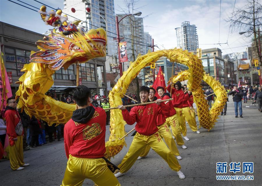 2月18日,在加拿大温哥华,人们在春节大游行中表演舞龙。当日,温哥华唐人街举行第45届春节大游行,数千人的表演队伍吸引了约十万民众到场观看。 新华社发(梁森摄)