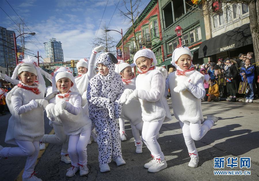 2月18日,在加拿大温哥华,孩子们打扮成小狗模样参加春节大游行。当日,温哥华唐人街举行第45届春节大游行,数千人的表演队伍吸引了约十万民众到场观看。 新华社发(梁森摄)
