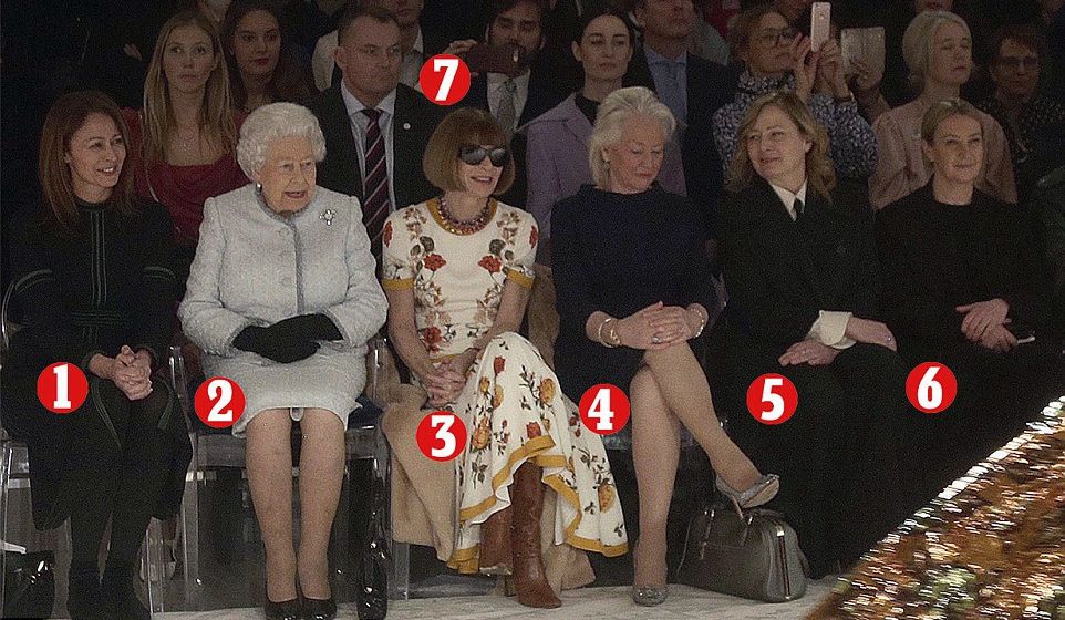 坐在前排的有英国时尚协会(British Fashion Council)首席执行官卡罗琳·拉什(1)、《Vogue》美国版主编安娜·温图尔(3)、英国皇家服装设计师安吉拉·凯利(4)、时尚评论家萨拉·缪斯(5)和英国设计师安雅·德玛斯(6),女王的安保人员(7)紧随其后。