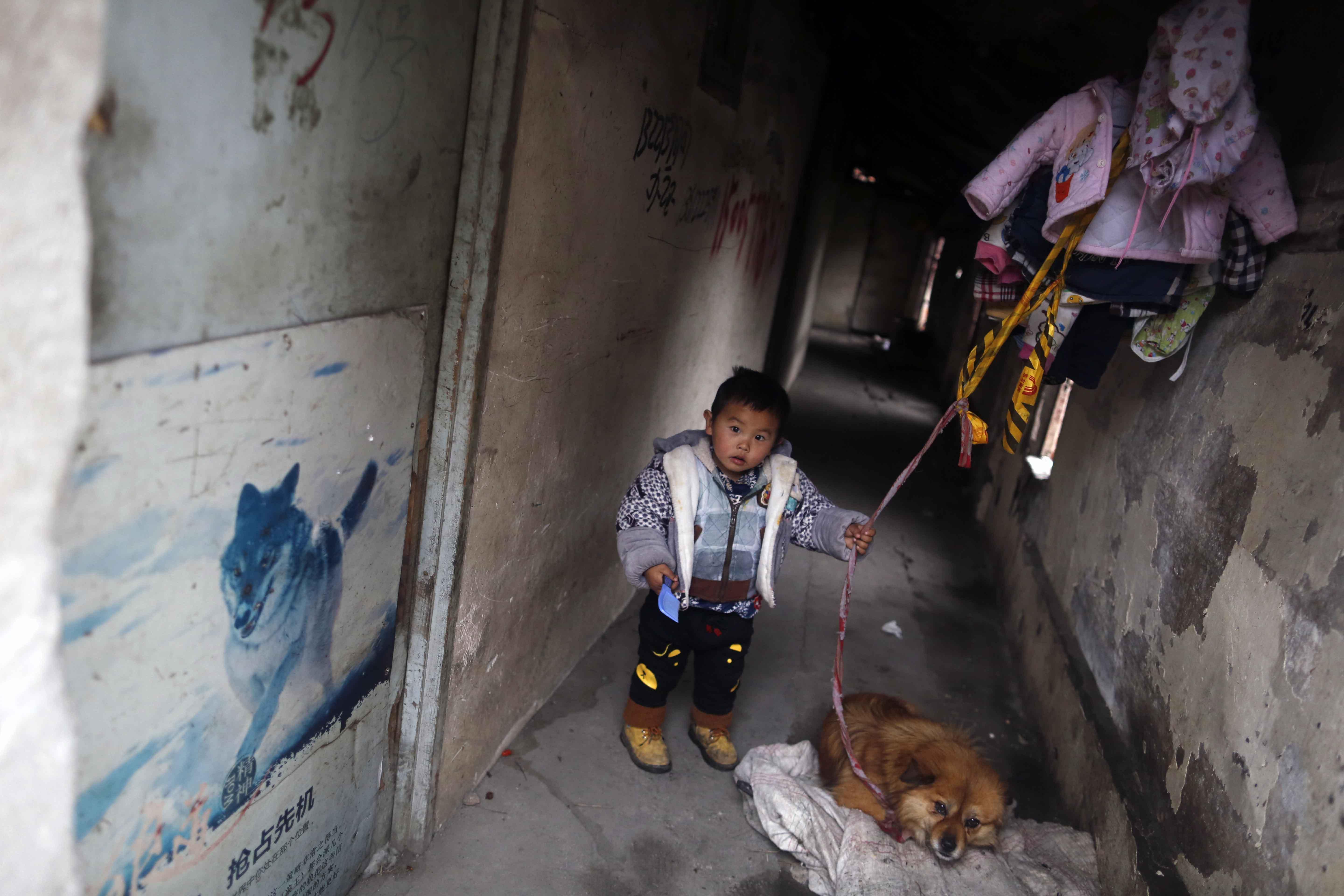 临行前,2岁多的罗天嘉对他的小伙伴(一只流浪狗)恋恋不舍。