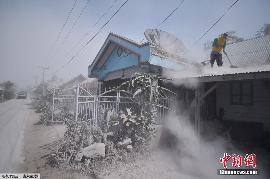 ​图为火山喷发后,一名当地居民清理自家屋顶上的灰尘。