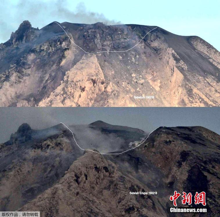 近日,印尼火山地质灾害局公布了一张对比图,图中上下部分分别是锡纳朋火山喷发前后,山顶部分的变化。可以从图中明显看出,经过19日的火山喷发,锡纳朋山山顶的一大块岩石被“喷”掉了,露出大片沟壑。