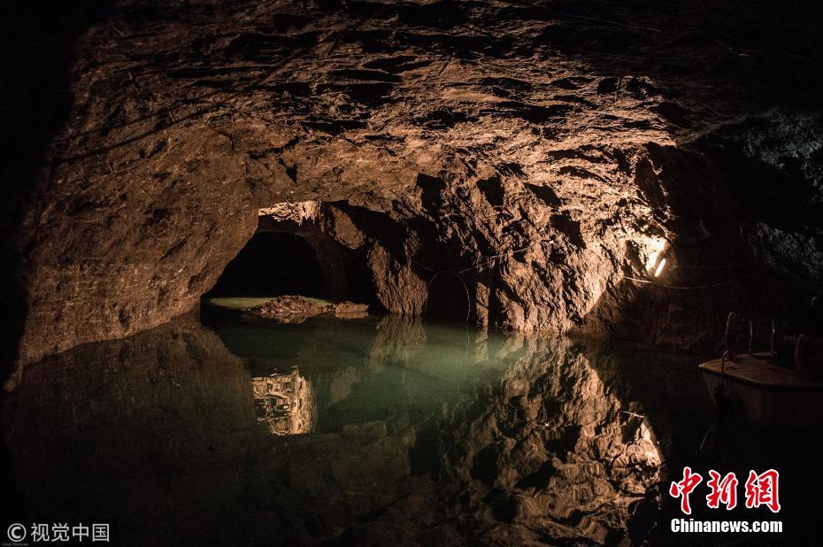 当地时间2018年2月22日,奥地利维也纳,欧洲最大的地下湖Seegrotte的内景。欧洲最大的地下湖被誉为地下童话王国,坐落在维也纳森林中。地下湖共分三层,以石灰岩为主要成份。这种灰红的石灰矿在1848至1912年间用来当作农业肥料。在1912年时发生了一次大水灾,矿井里渗入了两万公升的水。将这些有用的农业肥料全部冲走。1932年矿井正式开放,作为矿石遗迹的展示处供人参观。现在人们可经由这些地下通道,深入地下450公尺矿工休息及吃饭的地方。图片来源:视觉中国