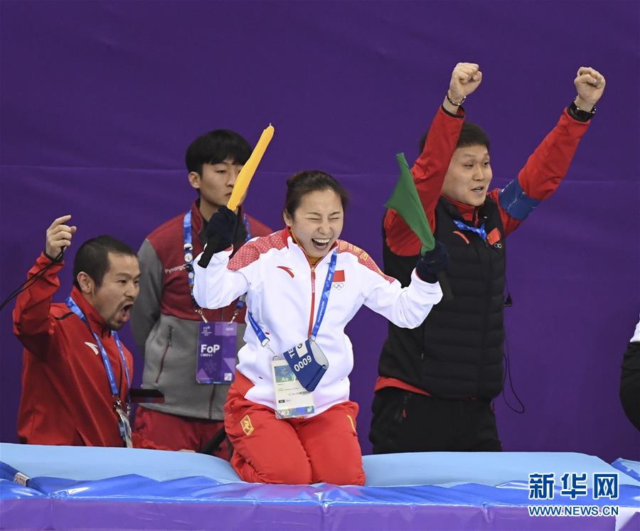 2月22日,中国队主教练李琰(右二)和教练组成员庆祝武大靖夺金。当日,在江陵冰上运动场举行的2018年平昌冬奥会短道速滑男子500米决赛中,中国选手武大靖夺冠,这是中国代表团在本届冬奥会上的首枚金牌。新华社记者王松摄