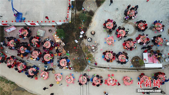 2月21日大年初六,广西柳州市鹿寨县寨沙镇古木村板里屯举行第四届百家开年宴。村民在村庄道路上摆出260桌菜品,2000多人共享龙虎山三宝焖虾、客家四件、白切鸡等客家特色菜,庆祝春节的同时祈盼五谷丰登、风调雨顺。组图来源:中新网