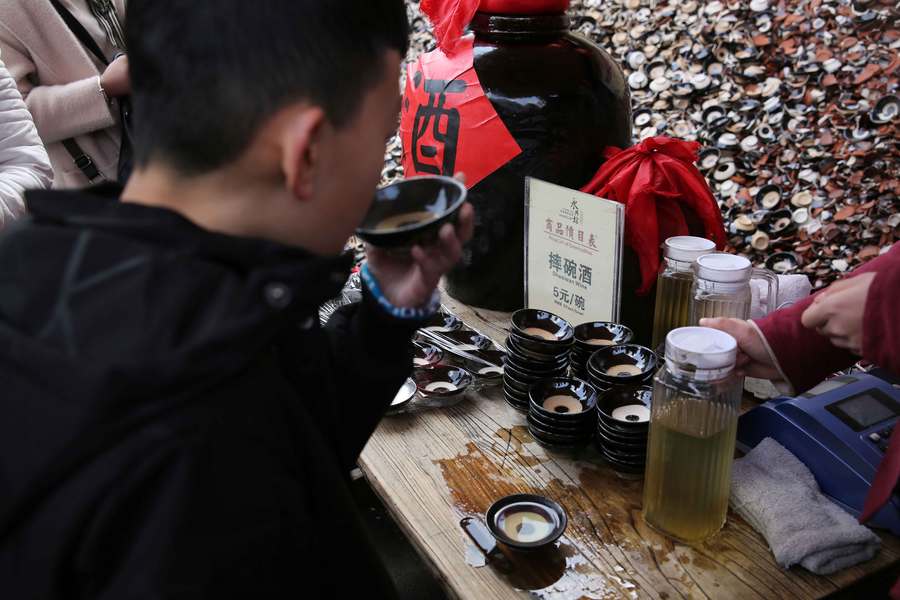 2018年2月21日,正月初六,西安城墙脚下的永兴坊,很多顾客花5元钱买一碗米酒,喝完碗里的米酒后,将陶瓷碗摔碎“求吉利、保平安”。 堆积如山的碎碗是店家的业绩,也是店家最吸引人的招牌。图片来源:东方IC