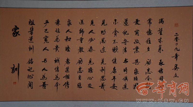 “从2012年开始合家宴上有了才艺表演,全是郭家人自己表演,有古筝、快板、歌曲等,但每年宴会的重头戏是全体郭家人颂读96字的家训,像“谦让为贵”、“诚信为本”等家训深刻影响我们的为人处事方式,也会继续影响我们的后代。”第三代郭家人郭青说,家训是根据长辈日常做事做人的行为规范总结出来的,每个郭家小家庭都有一个副本。