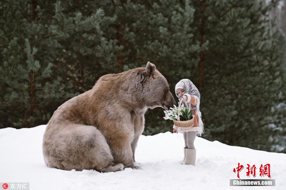 2018年2月23日报道(具体拍摄时间不详),对大多数孩子而言,有一只泰迪熊玩偶是再幸福不过的事了,陪玩又陪睡绝对是称得上绝佳玩伴,但如果把玩偶换成一头真正的大棕熊,你能想到会发生什么吗?摄影师Olga Barantseva用一组图片给了我们答案。Olga来自俄罗斯,他邀请了一些小萌娃,来到莫斯科一处森林,在这里,他们与一头体重50英石(317公斤)的大棕熊亲密接触。图片中,呆萌的小娃娃们或趴在棕熊背上玩耍,或手拿望远镜与棕熊一起遥望远方,又或手拎花篮,献花给棕熊,场面格外暖心。图片来源:东方IC