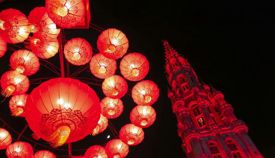 在比利时首都布鲁塞尔大广场前,中国灯笼与亮起“中国红”的布鲁塞尔市政厅尖塔交相辉映。