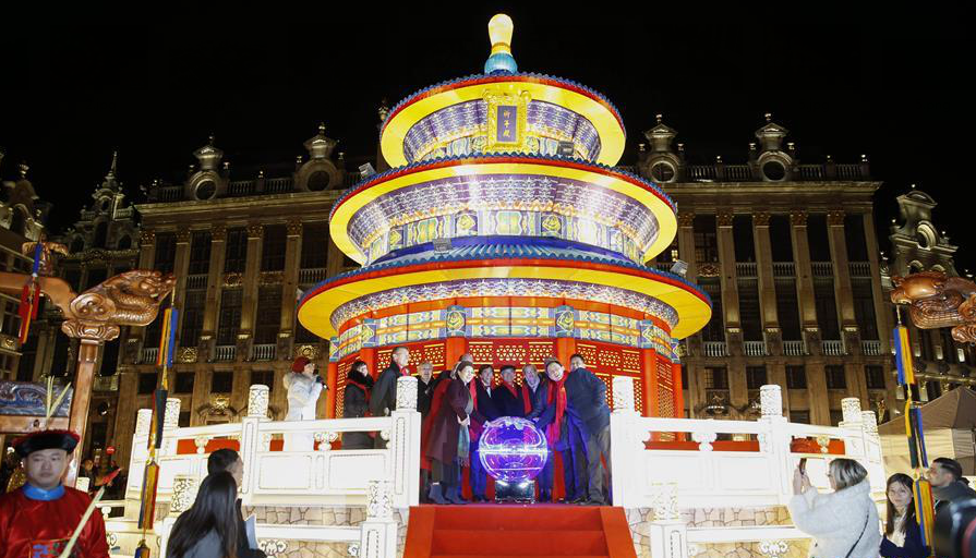 2月22日,在比利时首都布鲁塞尔大广场,嘉宾参加元宵灯展亮灯仪式。22日晚,璀璨夺目、中西合璧、别具一格的中国彩灯点亮了“欧洲心脏”布鲁塞尔的大广场,拉开了中国元宵灯展的帷幕。此次元宵灯展是2018中欧旅游年的重头活动。新华社记者叶平凡摄