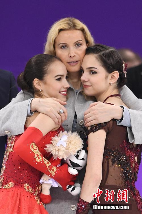 2月23日,平昌冬奥会花样滑冰女单自由滑决赛中,俄罗斯奥林匹克选手包揽前两名,15岁的新秀扎吉托娃获得冠军,梅德韦杰娃摘银,加拿大选手奥斯蒙德排名第三。图为教练艾特利·图特别丽泽拥抱两名获得金银牌的运动员。中新社记者 崔楠 摄