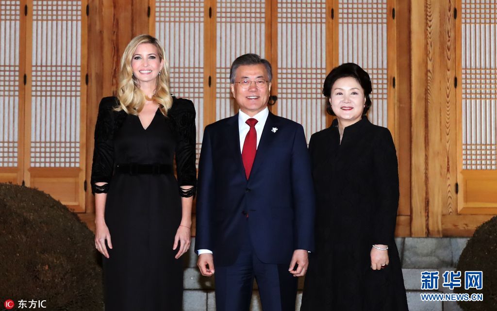 当地时间2018年2月23日,韩国首尔,韩国总统文在寅夫妇在青瓦台设晚宴,欢迎伊万卡来访。美国总统特朗普之女、总统助理伊万卡率领的美国代表团23日抵韩进行访问,并将出席平昌冬奥会闭幕式。(图片来源:东方IC)