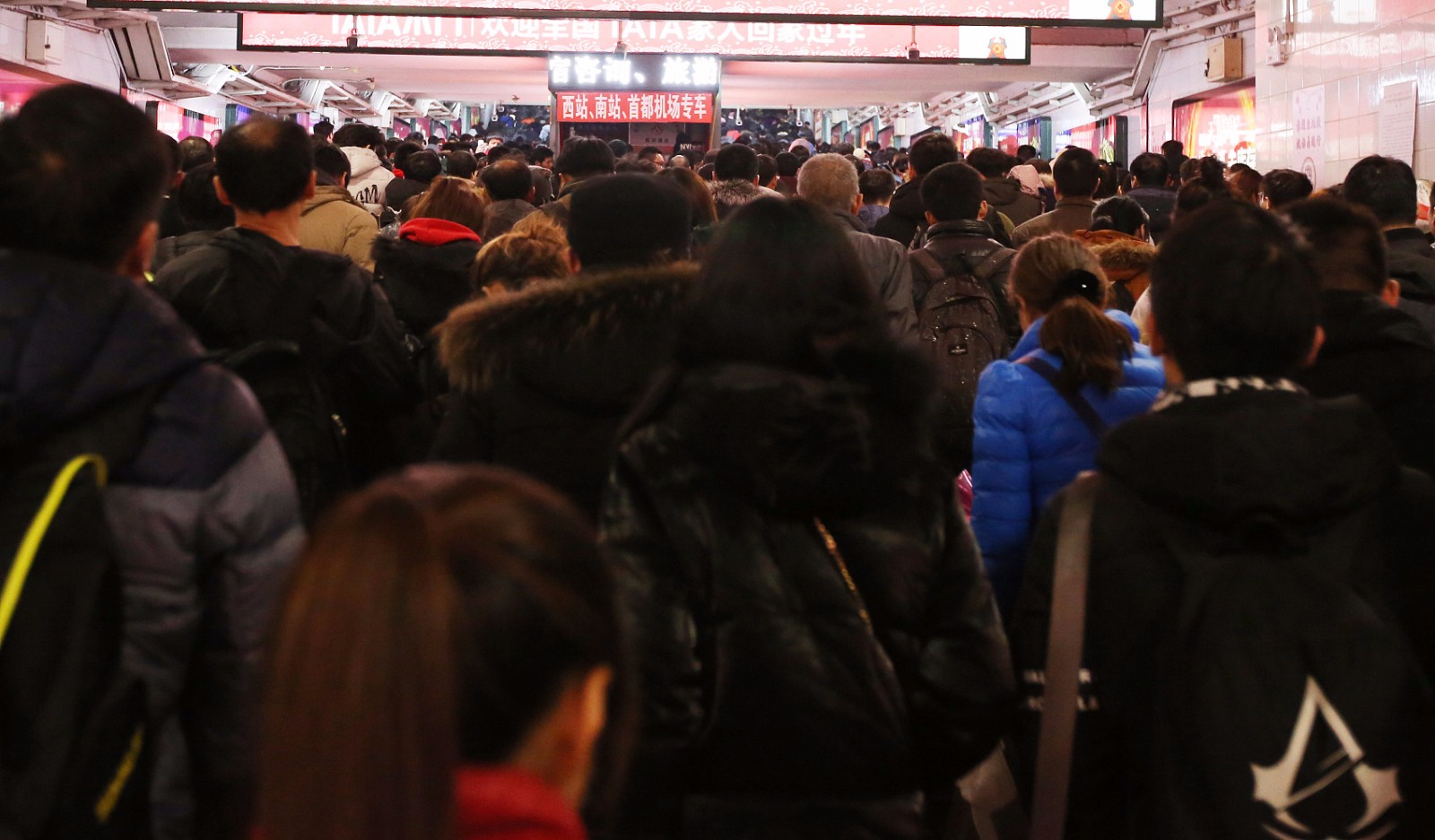 2018年2月23日,春节假期结束,北京迎返城客流高峰,旅游、探亲、务工等大批旅客连夜返城抵达北京火车站。旅客排长队打车,由于出租车较少,需等待1个多小时,队伍场面壮观。图片来源:视觉中国