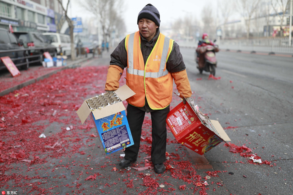 按规定,2018年春节期间,沈阳市三环绕城公路以内地区,烟花爆竹的燃放时间为:2月8日零时至2月22日24时(小年-初七),以及3月2日(元宵节),共计16天。图为清洁工正在清理燃放后的一地炮皮。